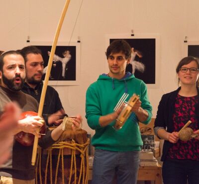 Die Fotografien von Annika Kreikenbohm sind eine wahre Zierde an unseren frisch geweißelten Wänden. Mit einer besonderen Fototechnik, Langzeitbelichtungen und vielen Blitzen in einer Sekunde ist es ihr gelungen, die Bewegungen bei Capoeria einzufangen. Herausgekommen sind hochästhetische Bilder, die Lust machen auf Bewegung und Tanz. Der Abend ließ kurzfristig die Wände von erLesen beben, da viele der Anwesenden in der Tanz- bzw. Kampfsportgruppe waren und diese uns die typische Musik in solch einer Trainingsstunde vorführten. (Petra Pohl)